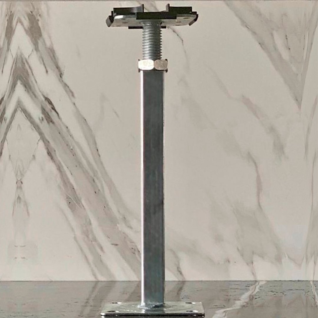 Contamos con pedestales de acero galvanizado, fabricados con troqueles y electrosoldadura, posterior a su fabricación se cubren con una capa de galvanizado por inmersión, lo que garantiza la no corrosión u oxidación, con tuerca niveladora con muesca antirotación, permitiendo una nivelación milimétrica que evita la desnivelación una vez instalado el sistema, disponible en alturas desde 6 cm hasta 180 cm, nivel piso terminado.