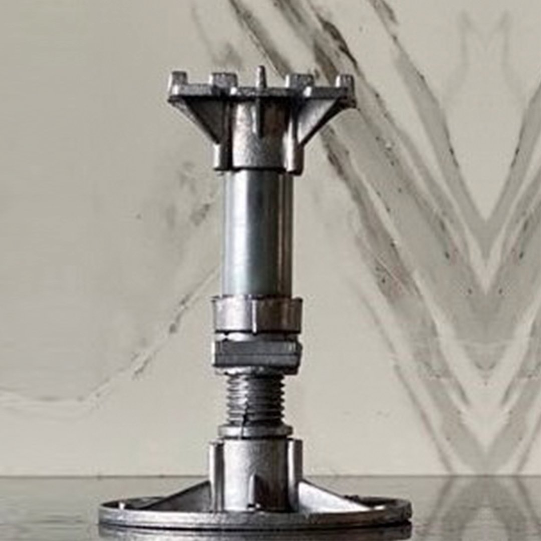 Contamos con pedestales de aluminio fabricados mediante fundición y ensamblados sin puntos de soldadura, lo que garantiza la no corrosión u oxidación, con tuerca niveladora cuadrada con ocho muescas antirotación permitiendo una nivelación milimétrica y arillo con cuatro muescas antivibración que evita la desnivelación una vez instalado el Sistema, para alturas desde 6 cm hasta 180 cm, nivel piso terminado.